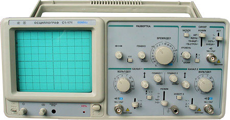 Двухканальный осциллограф С1-171 предназначен для исследования формы электрических сигналов и измерения параметров сигналов в диапазоне напряжений от 3 мВ до 30 В (до 250 В с делителем 1:10) и длительностей от 10 нс до 1,0 с.