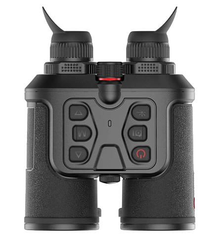 Визуально тепловизионный бинокль TN630 выглядит несколько необычно – внешне он напоминает бинокль, внутри это конструкция с одним объективом и двумя цифровыми экранами для комфортного наблюдения. Изображение с объектива обрабатывается и передаётся на оба экрана, что позволяет комфортно выслеживать цель на охоте, не утомляя глаза. Тепловизионный бинокуляр разработан на базе неохлаждаемого ик-детектора VOx, и полноцветным OLED-дисплеем с высоким разрешением 1024×768 пикселей. Плотность пикселей у TN630 составляет 12μm, инженеры Guide позаботились об идеальном качестве изображения. Частота обновления изображения составляет 50 Герц. Быстрая и точная обработка кадров - чёткая картинка без задержек и шлейфов, не дёргается как у тепловизоров с 9Гц. Кнопки управления расположены сверху и немного выступают над корпусом для облегчения доступа в темноте.