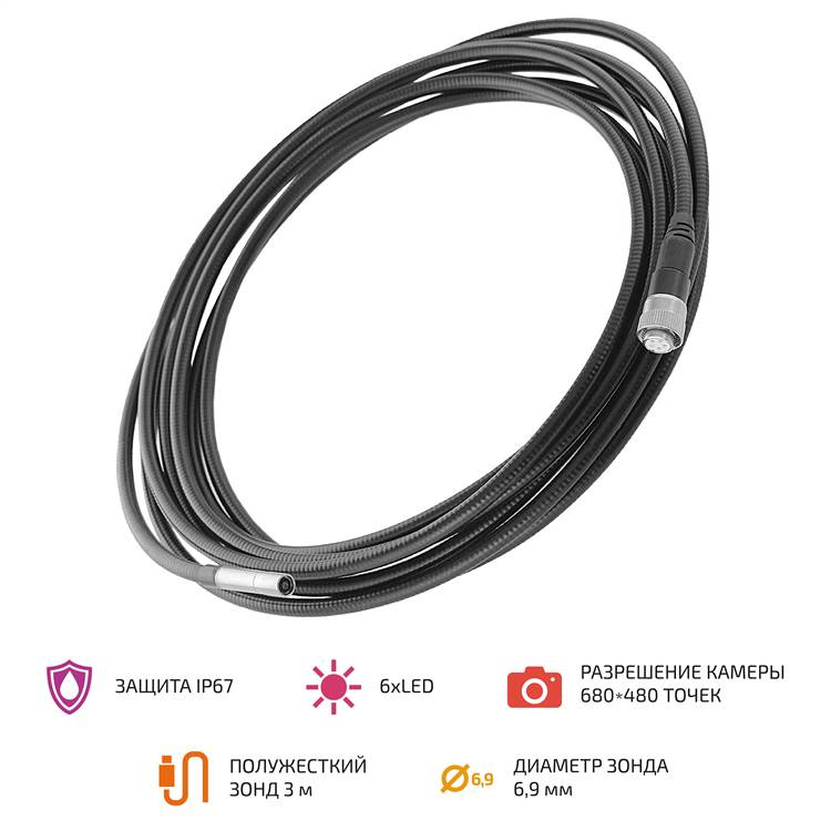Дополнительный зонд для видеоскопа МЕГЕОН 33500, оснащен 0,3 Мп камерой с функцией автофокуса и подсветкой из 6 светодиодов. Длина зонда 5 м. Видеозонд устойчив к попаданию воды и пыли, поэтому его можно использовать в самых удаленных и малоосвещенных участках.